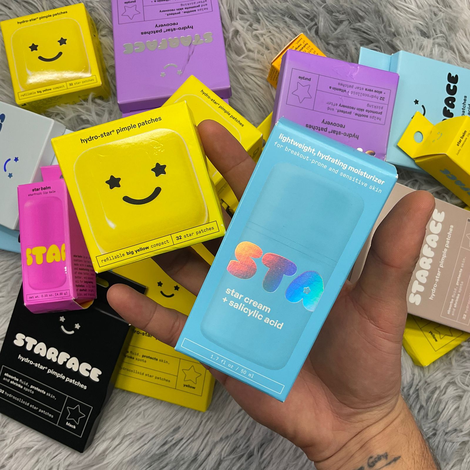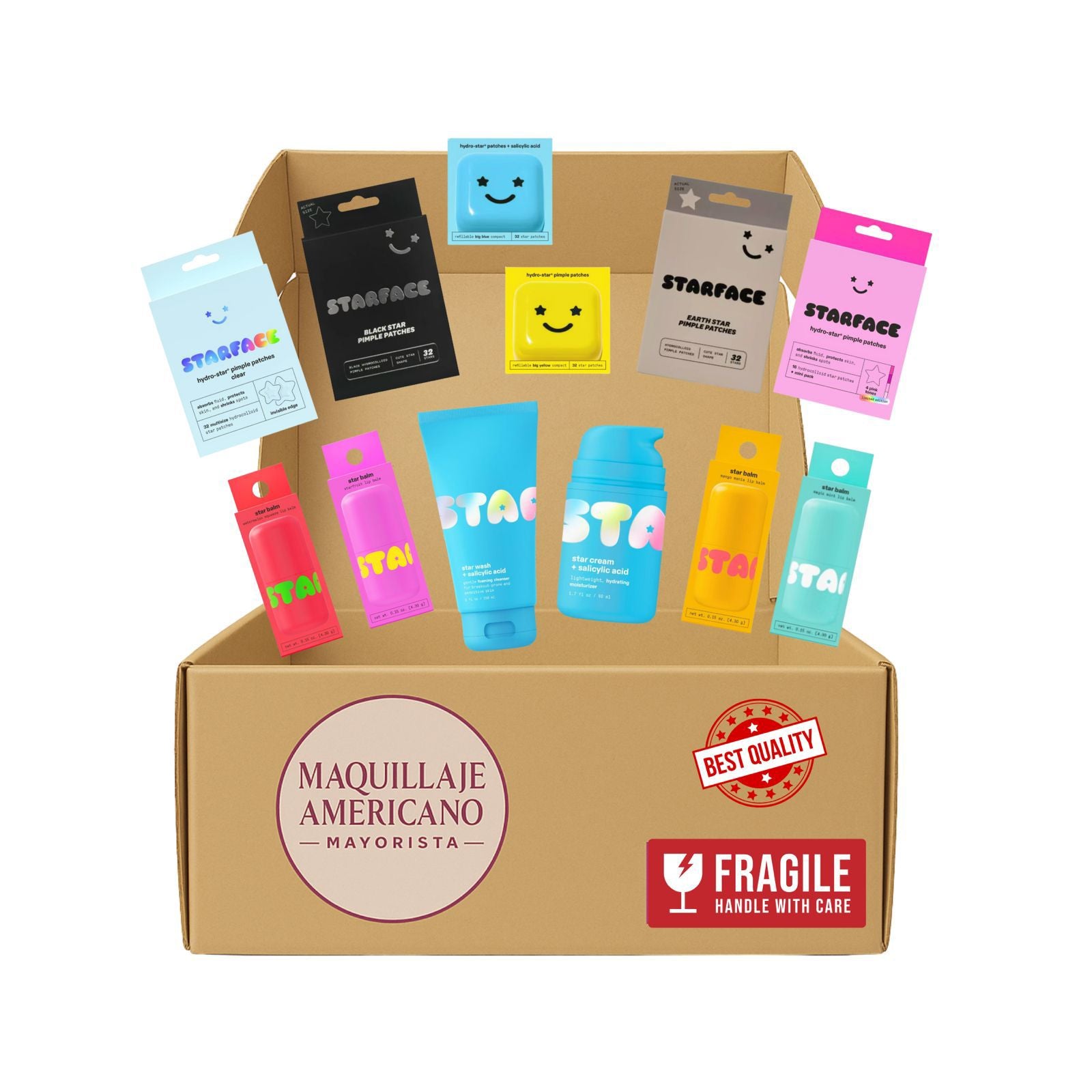 Incluye 20 productos originales de la marca Starface, famosos por sus parches en forma de estrella y skincare divertido que se ha vuelto tendencia a nivel mundial.