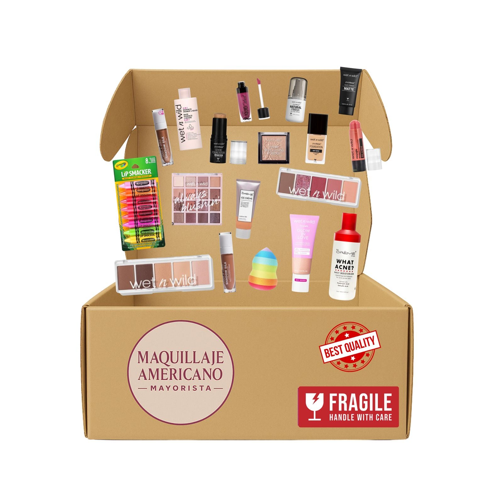 Incluye 100 productos originales de la marca Wet n Wild, reconocida mundialmente por su calidad, precios accesibles y gran variedad en maquillaje.